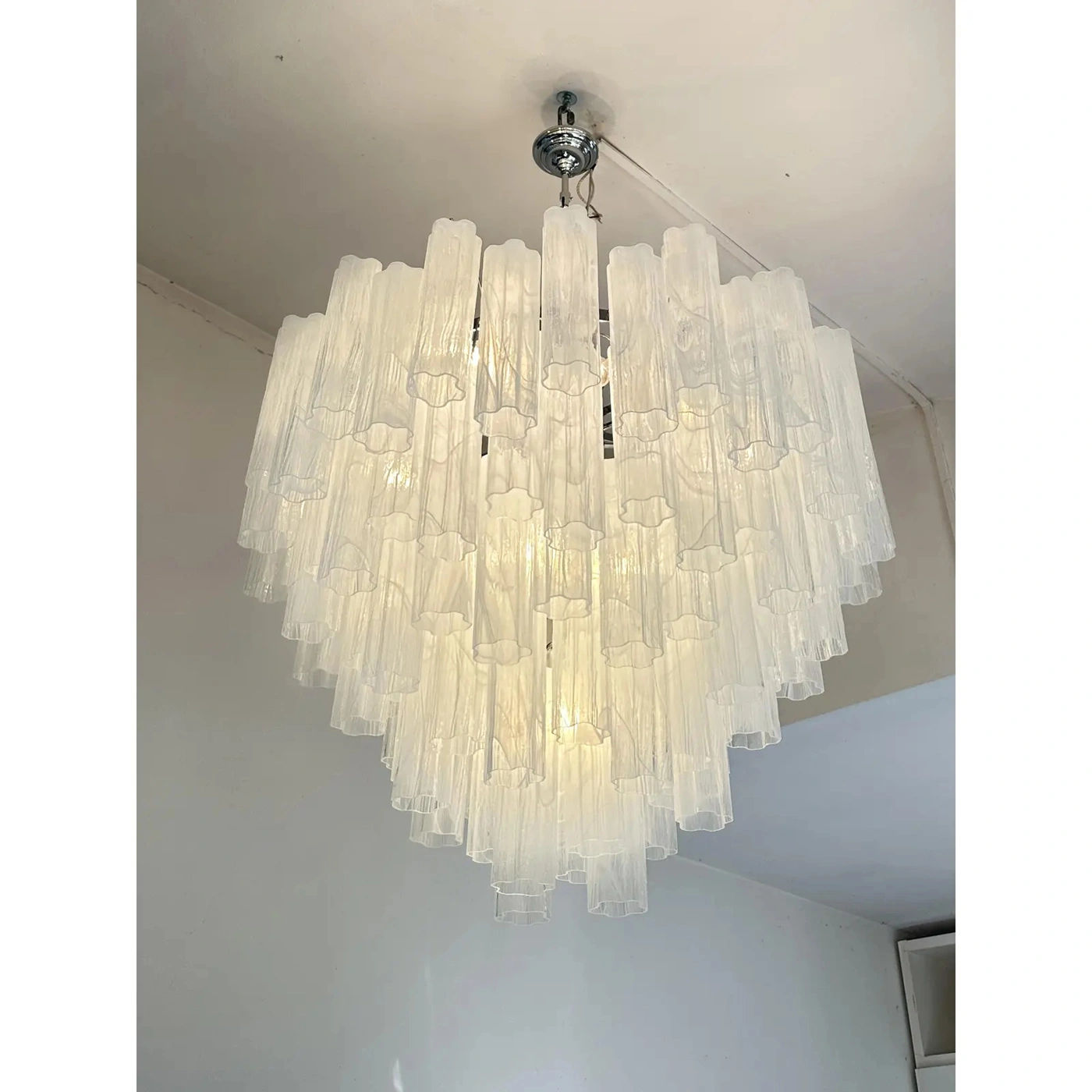 This round chandelier showcases a striking design inspired by the Venini style. The traditional mold of “tronchi” Murano glass is made with a new texture in venied-white that seems “alabastro”. Exclusive design By Simoeng.