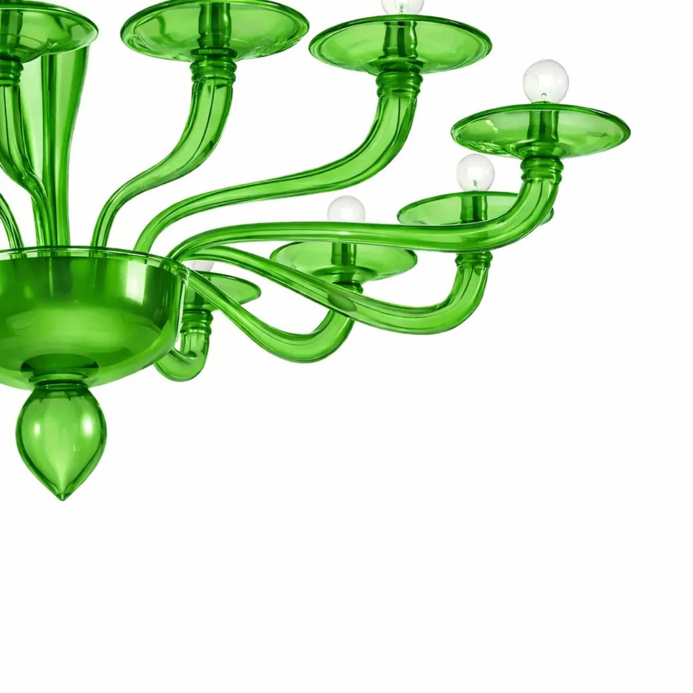 Elegant chandelier in green color made in Murano glass and chromed metal frame.