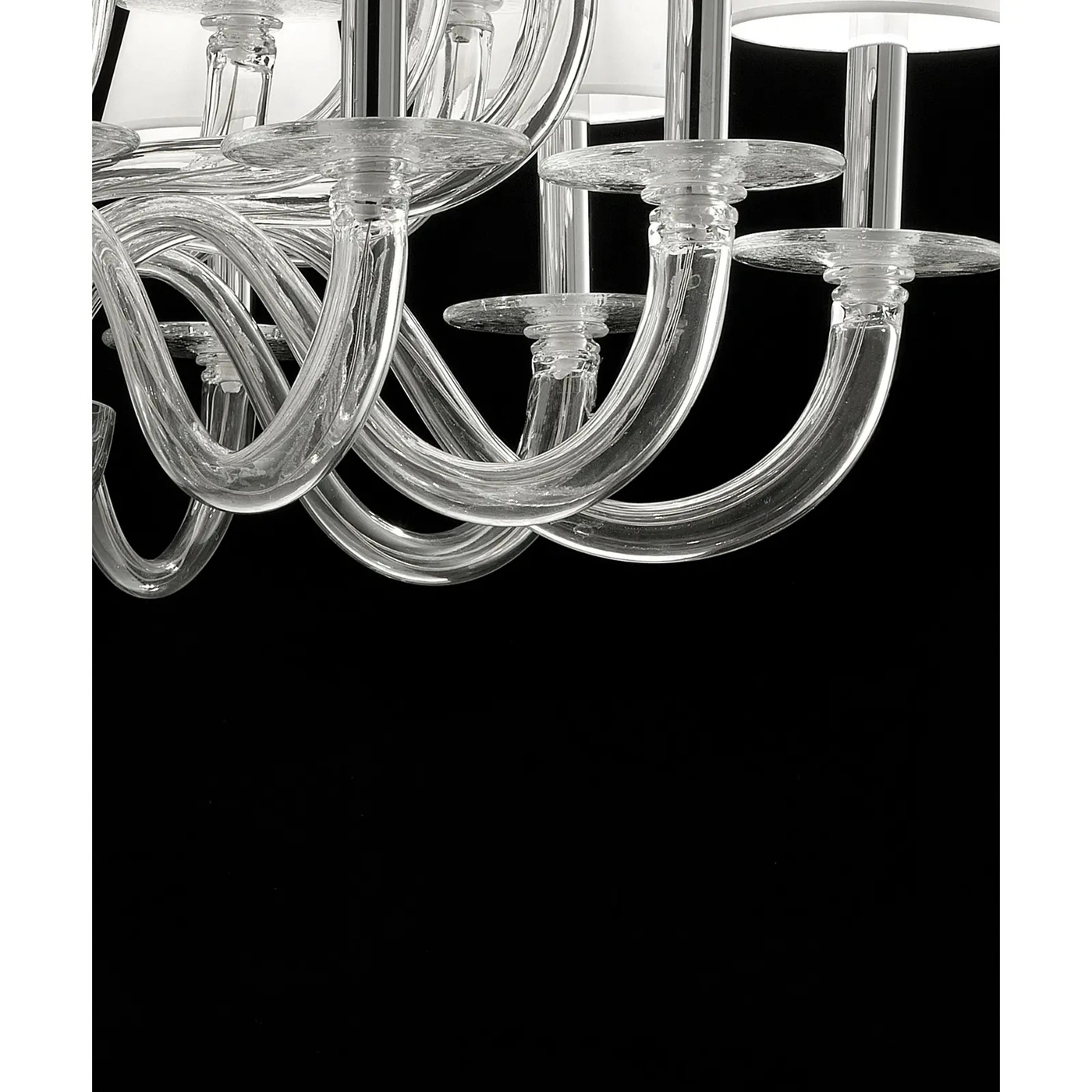 Elegant chandelier in transparent glass made in Murano and chromed metal frame.
