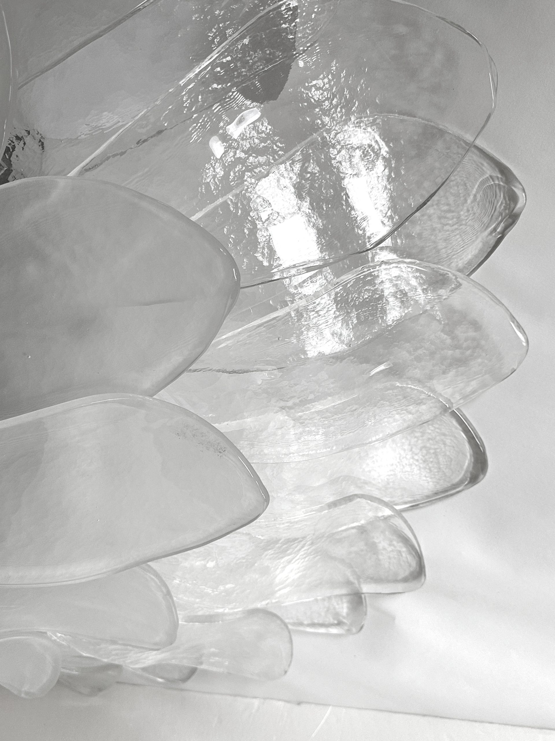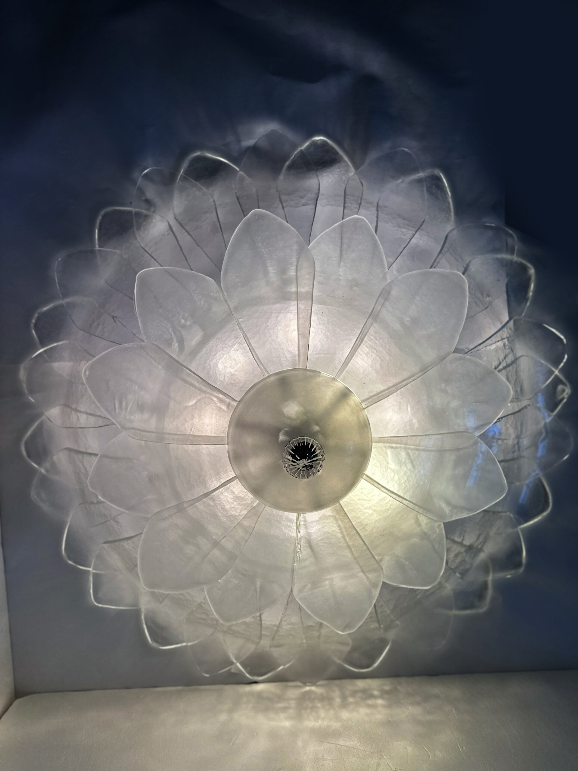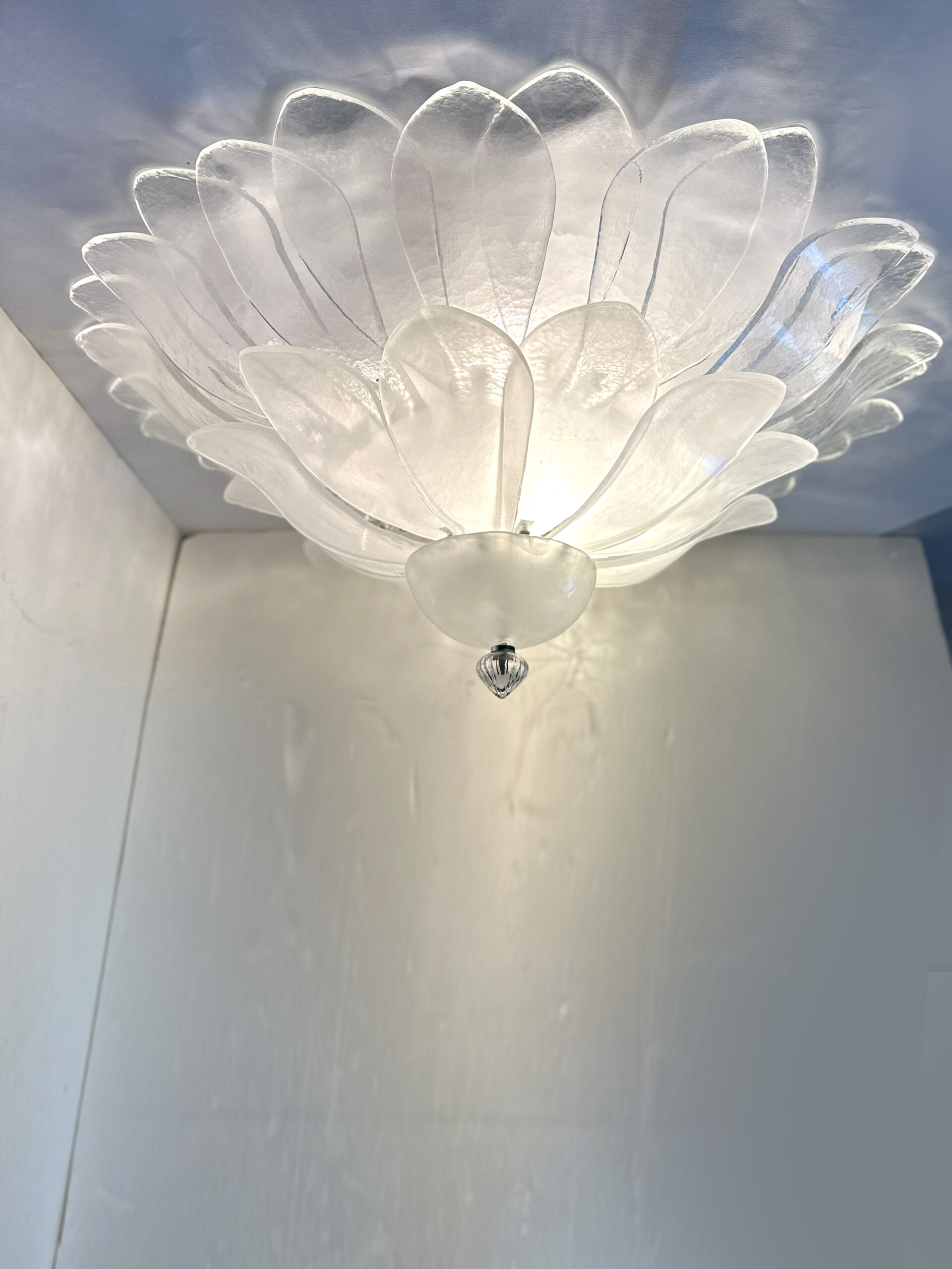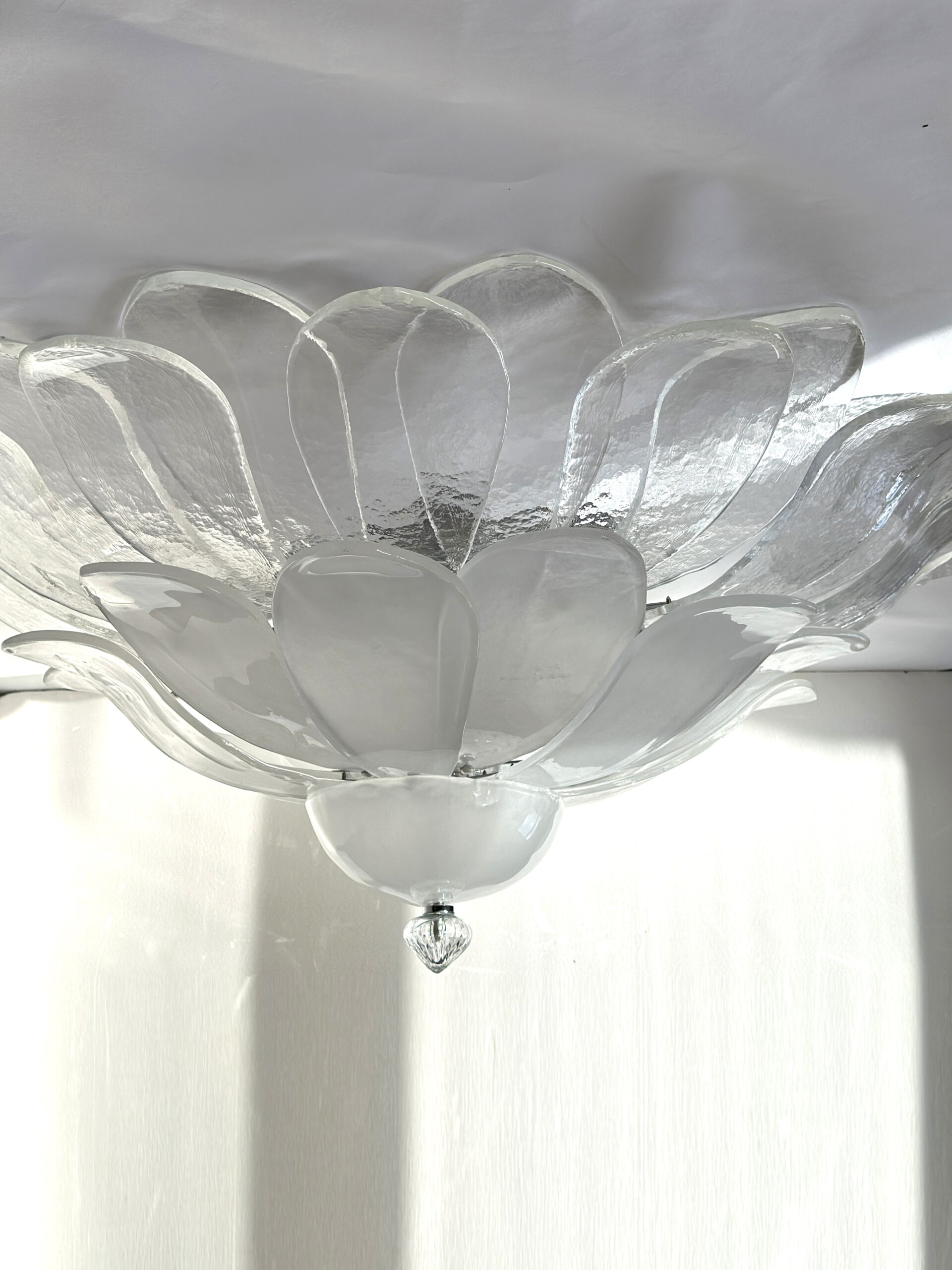 Scenographic lively ventian flush mount in Transpaerent and sanded “Petals” Murano glass.