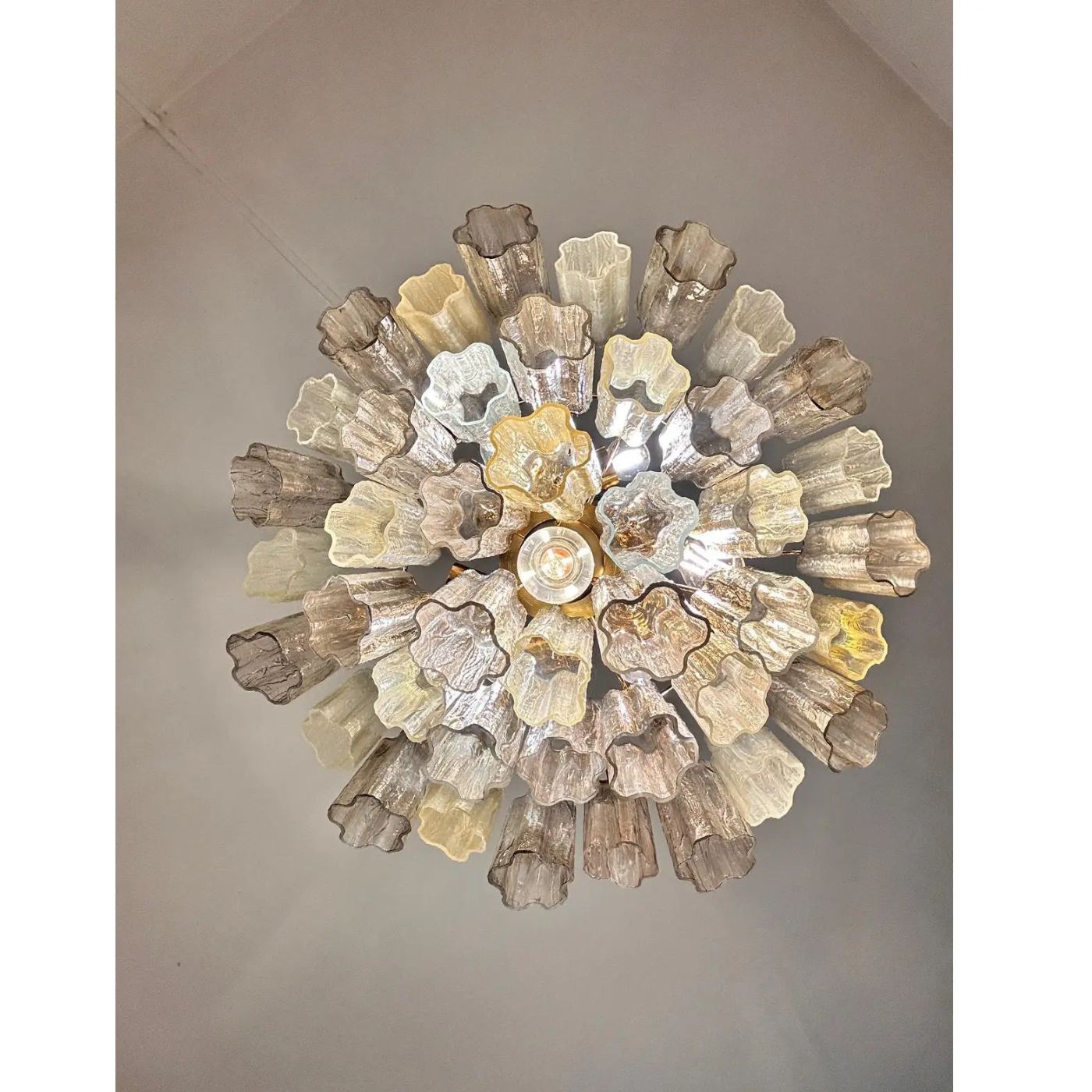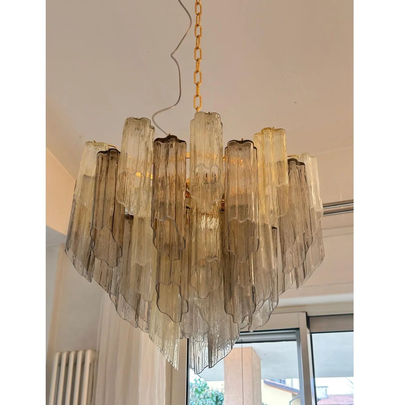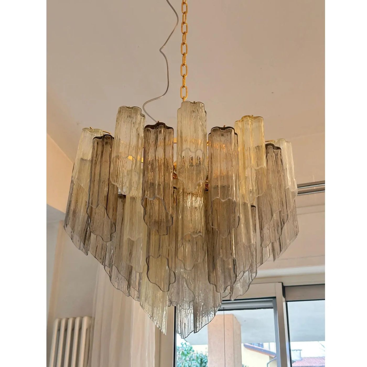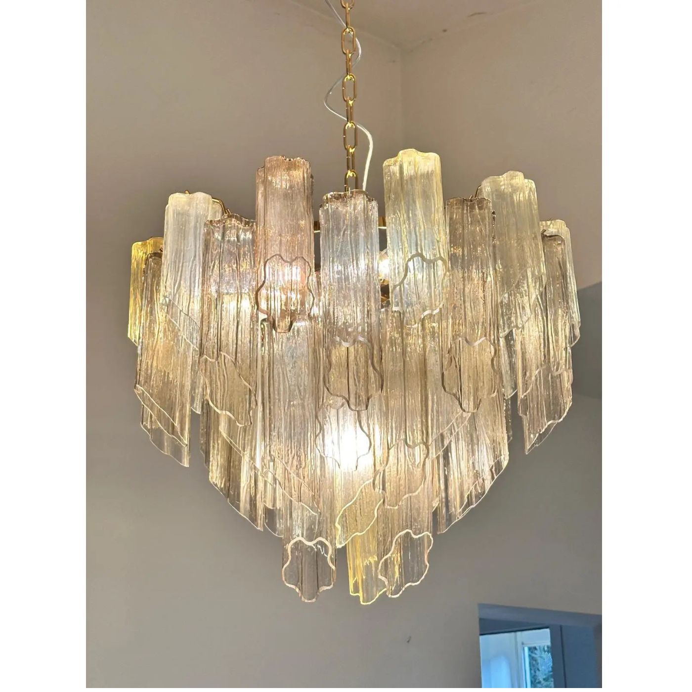 Scenographic italian hand-made chandelier with multicolored“tronchi”, elements of Murano glass.