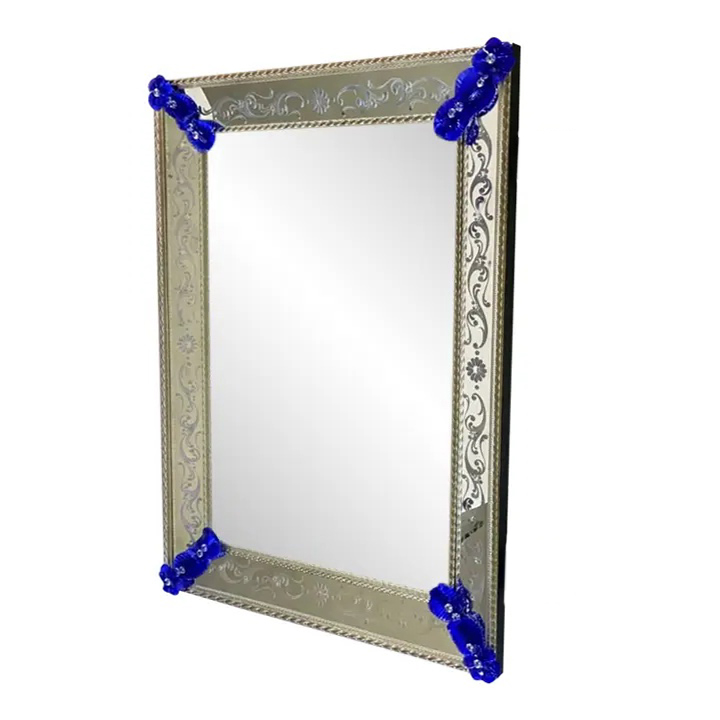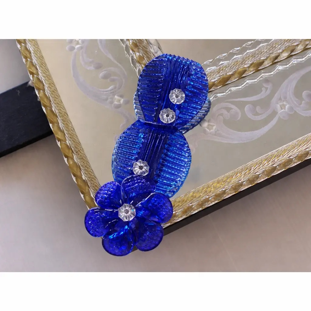 Contemporary Venetian Murano glass wall mirror with blue floral hand-carved details.