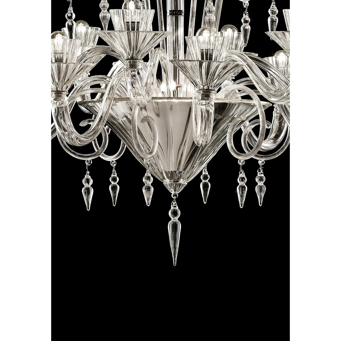 Scenographic venetian chandelier in transparent Murano glass .