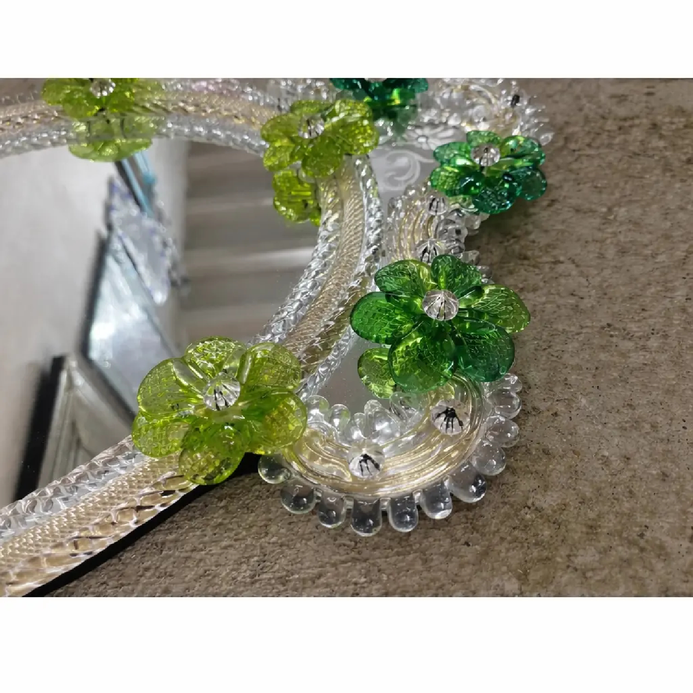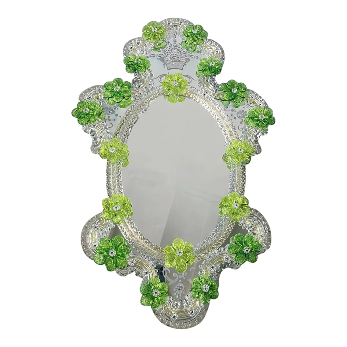 Impressive wall mirror with Murano glass style with transparent elements full of gold leaf and green flowers.