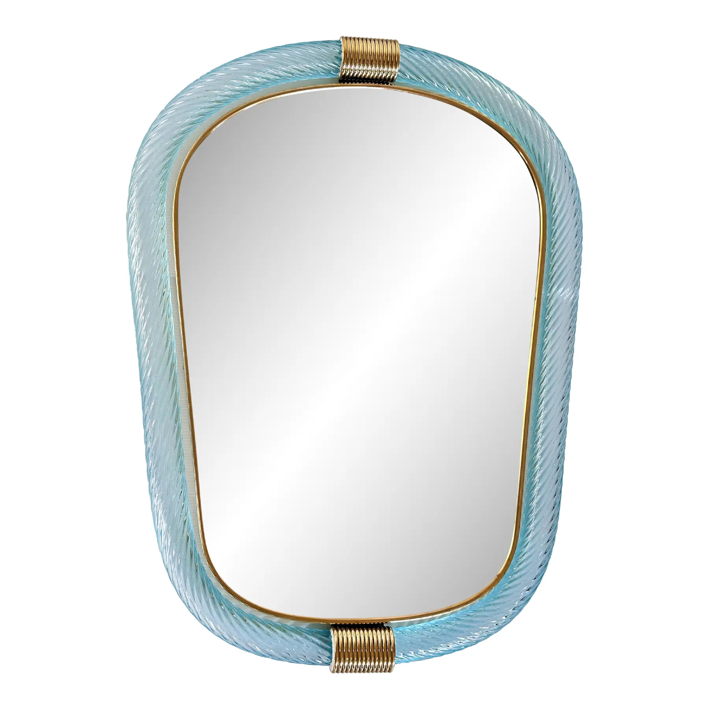Scenographic wall mirror in brass elements not laquered with light-blue and gold leaf inside working in “torciglione torchon” a traditional tecnique of Murano Glass.
