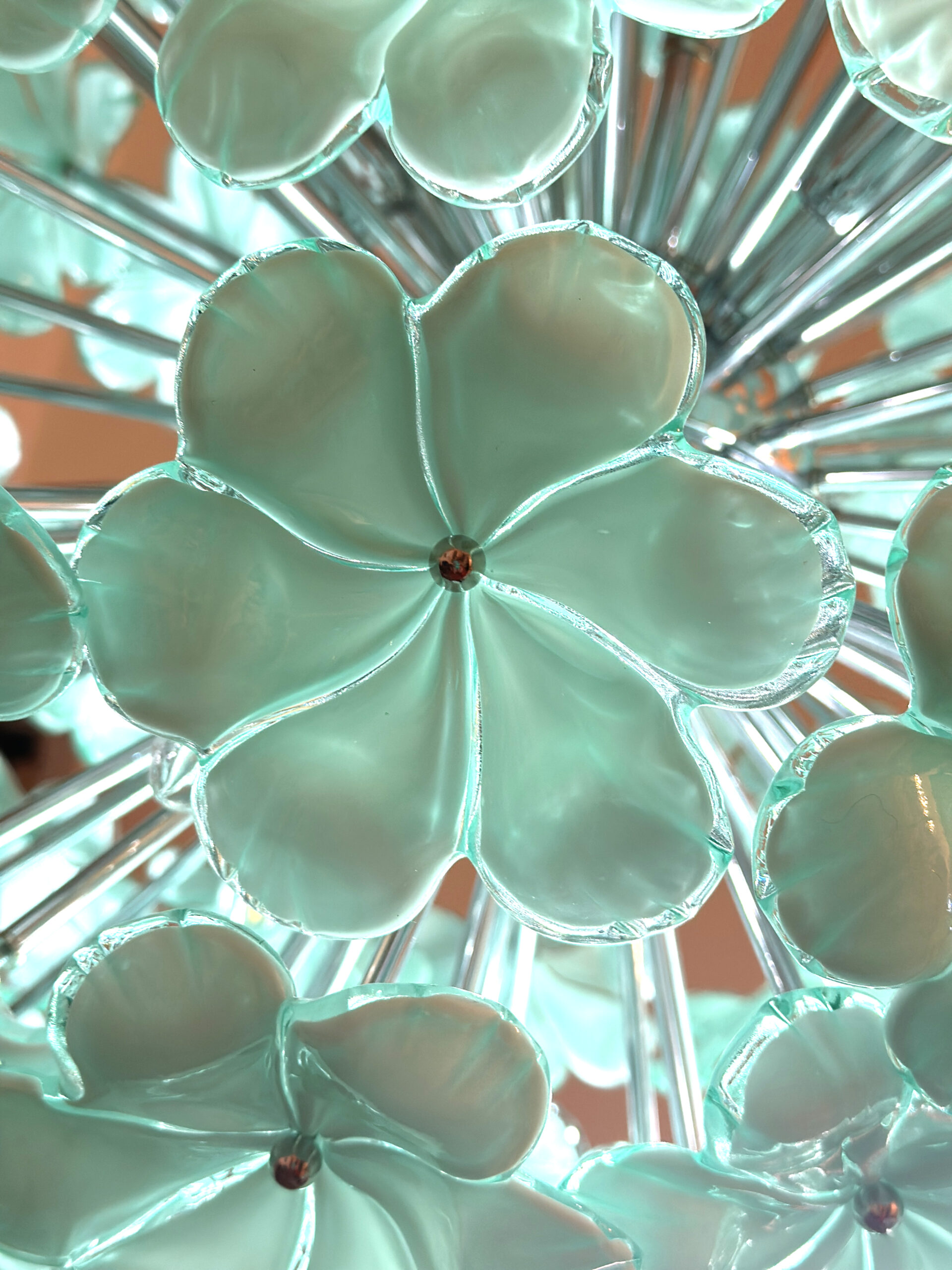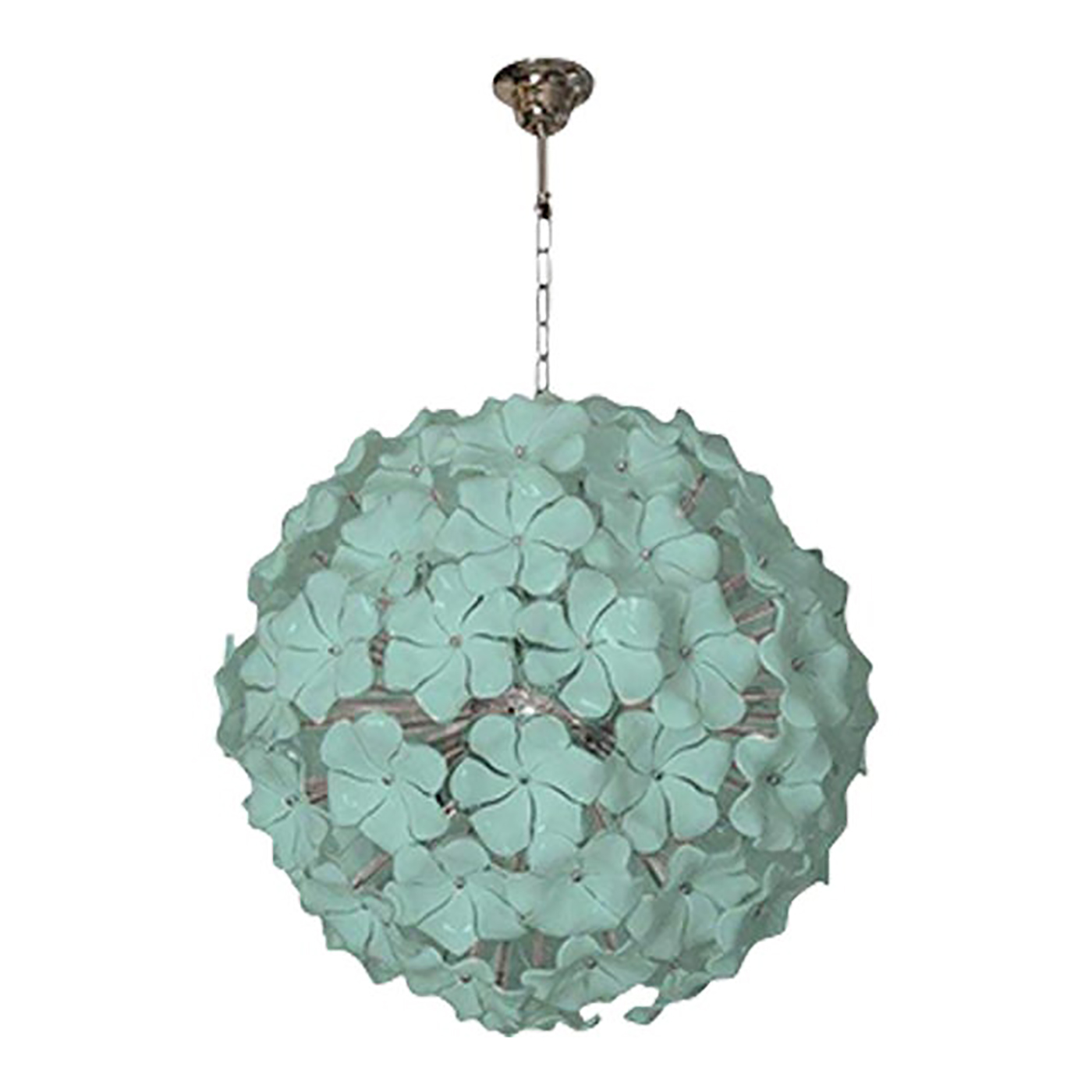 Contemporary Sputnik chandelier with green-wather lotus flowers blown in Murano glass.