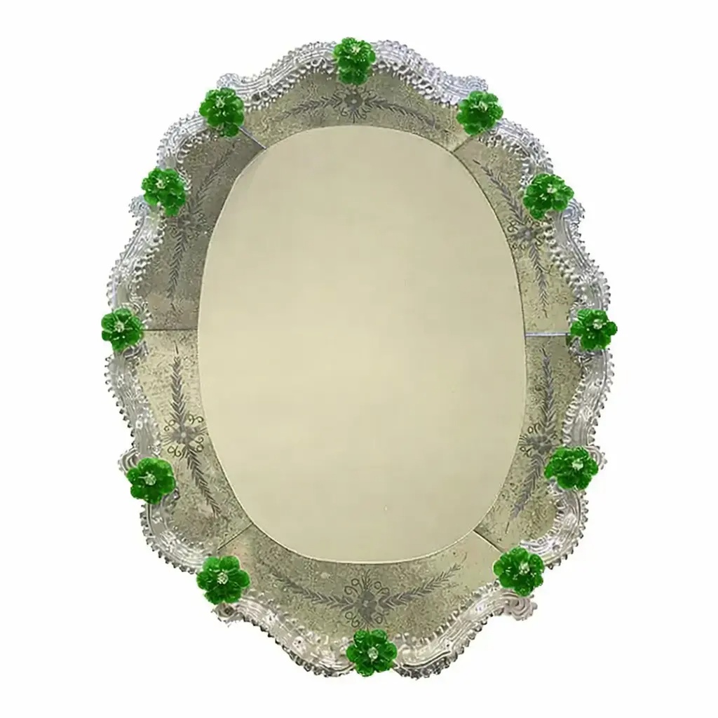 Spectacular oval mirror with Murano glass transparent elements and green flowers.