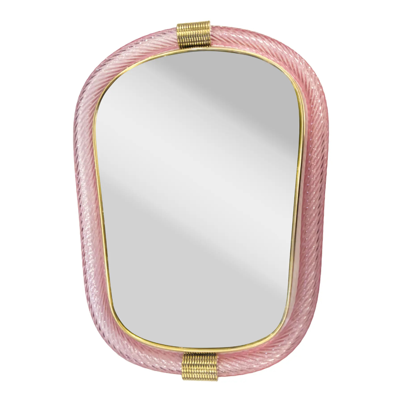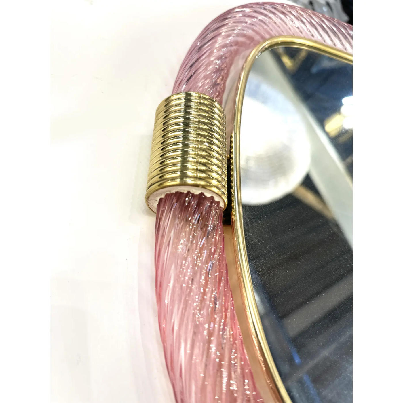 Scenographic wall mirror in brass elements with pink and gold leaf inside working in “torciglione”,torchon a traditional tecnique of Murano Glass.