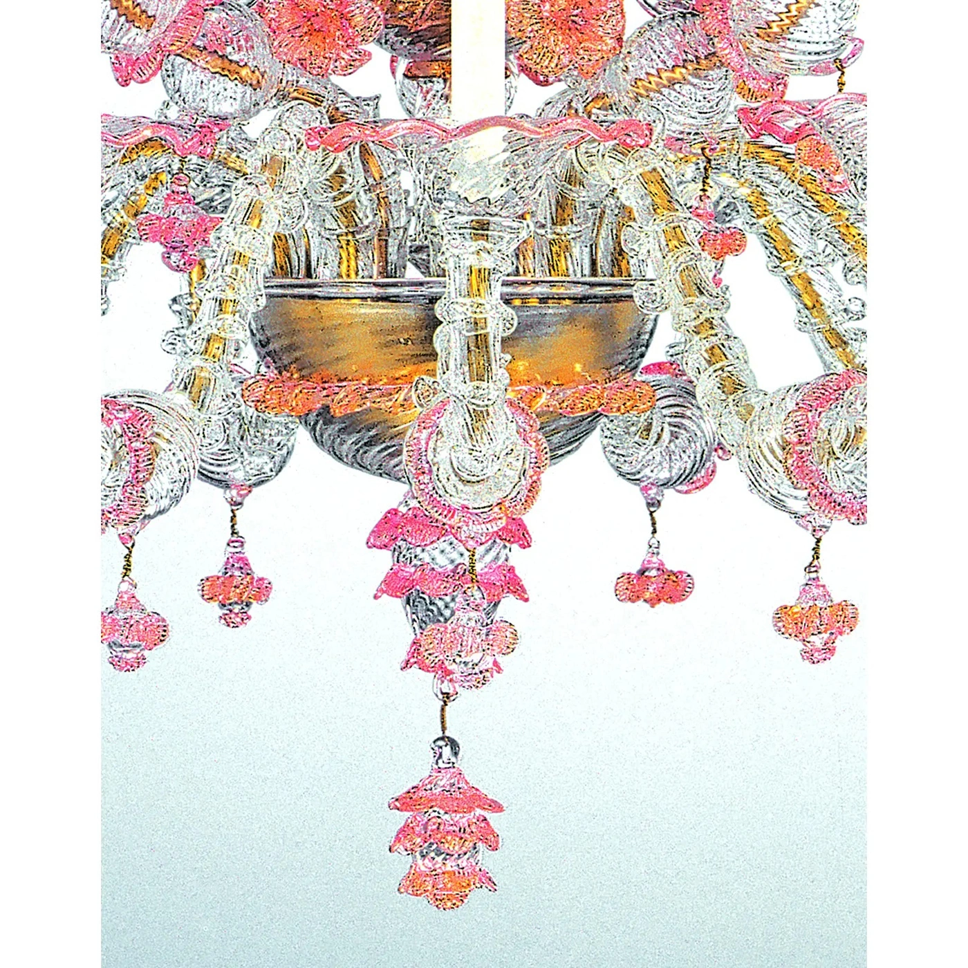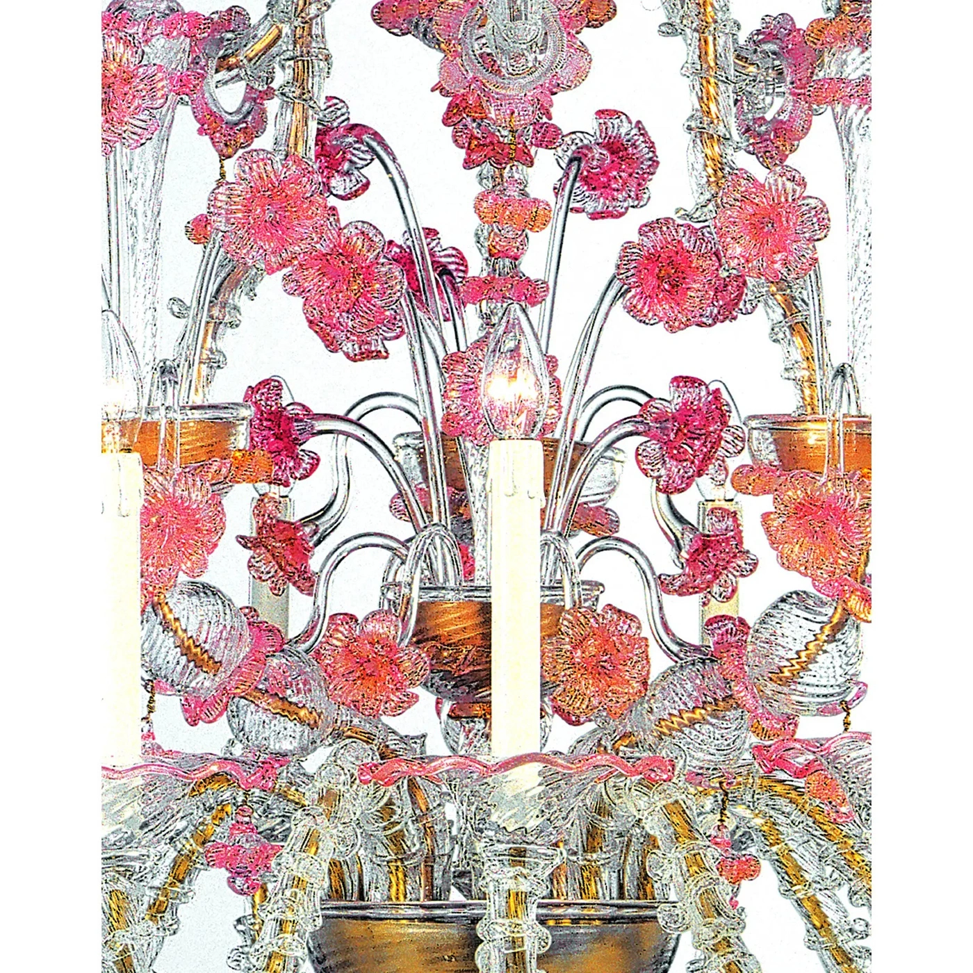 Impressive and scenographic Venetian Chandelier . The arms are working in traditional “Cà Rezzonico” Murano Glass . Full of pink detailed hand- pinched flowers fruit of hight italian craftmanship